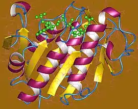 BVR is composed of two closely packed domains, between 247-415 amino acids long and containing a Rossmann fold.[4] BVR has also been determined to be a zinc-binding protein with each enzyme protein having one strong-binding zinc atom.[5][6]