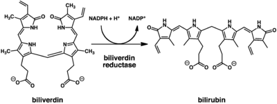 ![]() Reduction of biliverdin to bilirubin catalyzed by biliverdin reductase. |