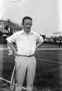 Until "Big Bill" Tilden began to defeat him regularly in 1920, Johnston had been the best American player for a number of years and was ranked No. 1 by the United States Lawn Tennis Association in 1915 and 1919.[7] In July 1919 Johnston had defeated Tilden in the final of the U.S. Clay Court Championships.[8] A month later, Johnston had beaten Tilden in three straight sets in the final of the 1919 US Championships, then Tilden overtook him in 1920. Johnston remained competitive with Tilden for the next seven or eight years, but was never able to beat Tilden in an important match again. For instance, in 1922 Johnston defeated Tilden three times out of four occasions but Tilden beat Johnston in the final of the U.S. Championships in five sets.[9] In 1923, despite Johnston winning both the World Hard Court Championships and Wimbledon, he again failed to beat Tilden at the US Championships, losing in three one-sided sets. Johnston again threatened to get closer to beating Tilden on the big stage in following years, but memorably lost the 1925 US Championships final in five sets to Tilden. Johnston was runner-up a record six times in the US Championships, This is still a record today. Together Johnston and Tilden won seven consecutive Davis Cup trophies, from 1920 to 1926, a record that still stands.[10] In September 1927, Johnston announced his retirement after the U.S. Davis Cup loss to the French team consisting of the 'Four Musketeers' and confirmed his decision in mid-1928.[11] He turned down an offer to become professional.[12]