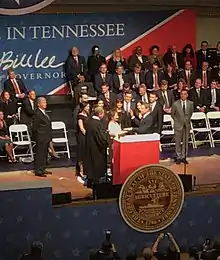 - Ebert, Joel; Allison, Natalie (January 19, 2019). "Bill Lee sworn in as Tennessee's 50th governor, nearly 2 years after long-shot bid". The Tennessean. Retrieved 2019-01-19.