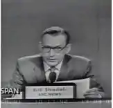 Willard Franklin "Bill" Shadel (July 31, 1908 – January 29, 2005) was an American news anchor for CBS Radio and ABC Television. Shadel was born in Milton, Wisconsin, one of five children and the younger of two sons of Franklin Luther and Ida Louise Pachel Shadel. He was musically talented and in his early years provided music for silent movies.[1] He graduated from Andrews University in Michigan. Shadel assumed direction of the college band and orchestra in 1929, while still a student and then worked as an assistant program manager for the college's radio station, responsible for music presentations that included his performing as a soloist on marimba, saxophone, clarinet, and trombone and him directing bands and choirs for the station. His work as a soloist and with these groups, which also gave programs for the school, was an immediate hit with their members and the campus at large. While at Andrews University, he married Marion I. Kocher and they had two sons, Willard F., Jr. and Gerald I. He led the groups for two years following his graduation in 1932, while teaching political science courses, and then left to lead the band, orchestra, and choirs at Washington Missionary College, now Washington Adventist University, in Washington, D.C. He received a master's degree in history from the University of Michigan.[2] Shadel began his career as a musician in silent-movie theaters before taking his marimba to live radio. Shadel began writing for various National Rifle Association journal The American Rifleman. Shadel received press credentials from CBS and shipped overseas to cover the European Theater. His duties were taken over by his associate editors, and The American Rifleman carried articles and interviews by Shadel up until the end of the war.[3] [4] Edward R. Murrow recruited Shadel while he was working in Europe as a correspondent for the National Rifle Association. During World War II, Shadel covered the June 6, 1944, D-Day invasion for CBS Radio. During his years at CBS, Shadel worked alongside Murrow, Howard K. Smith, Walter Cronkite, and Eric Sevareid.[5] He and Murrow were the first reporters in the German concentration camp at Buchenwald. They came by jeep and were swarmed by the starving and dying. Mr. Shadel said it was the memory of the living, not the multitudes of dead, that stayed with him most.[4] After the war, Shadel reported from Washington, D.C., trying his hand at television at WTOP-TV as a Capitol Hill reporter for the local CBS news program then anchored by Walter Cronkite.[4] Each week on WTOP-TV, a local department store sponsored a fashion show; Shadel met and fell in love with one of the models. She became his wife of more than 56 years, Julie Strouse.
