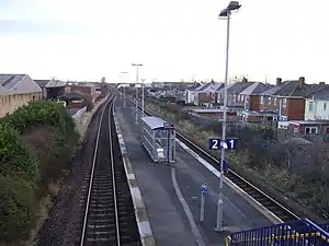 The station is a modern-style halt on the line and was opened on Monday 7 November 1966 to replace the town's original grander station located further west towards Norton; this closed the previous day[1] and was subsequently demolished in the early 1970s. It was located to the west of the junction between the Durham Coast Line and the earlier Port Clarence Branch of the Clarence Railway,[2] adjacent to the level crossing carrying the old route of the A19 across the railway. Only the signal box and footbridge survive on the site of the original station.