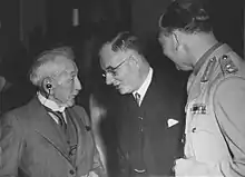 Hughes, unlike Wilson or South African Prime Minister Jan Smuts, demanded heavy reparations from Germany, suggesting the sum of £24,000,000,000 of which Australia would claim many millions to off-set its own war debt.[56] Hughes was a member of the British delegation on the Reparations Committee, with Lord Cunliffe and Lord Sumner.[57] When the Imperial Cabinet met to discuss the Hughes Report, Winston Churchill asked Hughes if he had considered the effects that reparations would have on working-class German households. Hughes replied that "the Committee had been more concerned in considering the effects upon the working-class households in Great Britain, or in Australia, if the Germans did not pay an indemnity".[58]
