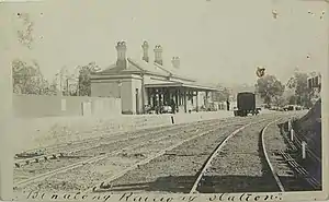 The Binalong railway station and telegraph office is the older of two closed railway stations in Binalong on the Main Southern railway line in New South Wales, Australia. The station opened in November 1876 as the terminus of the Bowning-Binalong section of the line. Following a fire to the original wooden building in 1883, a new stone and brick building was constructed. This was in use until 1916 when the line was deviated in conjunction with duplication. The station house and telegraph office remain today as a building of important historical significance in the town.