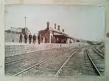 On Sunday 22 April 1883, the original wooden station building was destroyed by fire.[2][3] A coroner's inquest failed to find a cause of the fire despite hearing evidence from many witnesses. Special praise was given to a young fettler, William Nettleton, who bravely risked injury to save three chairs.[4][5] Just over a month later Binalong was celebrating the completion of the brickwork of the new, sturdier station. George Reynolds, the bricklayer, was toasted by the attendees for his work. The celebratory atmosphere also saw toasts to the Queen, the district engineer, the inspector, the carpenters, the Press and the station master and his wife; Mr and Mrs Rae.[6]