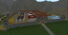 An extensive civilian settlement (vicus) existed to the north and west of the fort, the remains of which are buried under the pastures of Binchester Hall Farm. The southern part of the fort is now beneath Binchester Hall, while some of the defences were destroyed in a landslip in the 19th century. Part of the stone bridge used by Dere Street to cross the River Wear can still be seen when the river is low.[5] In 2007, several mausolea were found to the north of the vicus.