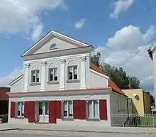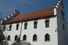 The town's 1836 synagogue, designed by Friedrich von Gärtner and notable as the first to use the horseshoe arch of Moorish architecture for windows and portals, was plundered in the Reichskristallnacht but not set ablaze because of its proximity to other buildings. It was restored beginning in 1987 and since 1996 has served as a community center, open to visitors on Sundays.[3][4] Other remnants of Binswangen's former Jewish community, which dates back to at least 1609, are the memorial site of the Jewish cemetery destroyed by the Nazis and the landmark Schilling House (ca. 1840).