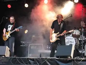 The Bintangs (after the Bahasa Indonesia word for "star") were established in 1961 as an indorock band, performing covers at live venues in Beverwijk.[3] The original lineup was Frank and Arti Kraaijeveld on bass and guitar, respectively (both performed vocals), Meine Fernhout on guitar, and Jimmy Jansen on drums.[4] Frank, in a 1985 interview, mentioned how impressed he was when he first saw the Tielman Brothers play, and soon the band began mixing in R&B influences, in part inspired by The Rolling Stones and in part to differentiate their sound from that of the many bands playing in the vein of The Shadows.[2] In 1965 they recorded their first single, on Muziek Express, Willie Dixon's "You Can't Judge a Book by Looking at the Cover" (another song that was made famous by Bo Diddley and was also written by him, "I'm a Man", was the B-side), with Henk van Besu on drums, Jan Wijte on rhythm guitar, and Will Nimitsz on vocals and mouth harp. A loyal fanbase had, by the mid-sixties, risked life and limb to paint the band's name on a gas holder in Beverwijk.[2] By 1969 they had opened for The Rolling Stones and The Kinks[4] and released several further singles (three with Muziek Express[3]).[5] In 1969 they signed with Phonogram Records,[6] with whom they released their first album, Blues on the Ceiling.[4] Their greatest hits, "Ridin' on the L & N" and "Travelling in the U.S.A., were released in 1969 and 1970, respectively.[7] By this time, the band had a steel guitar player as well, Rob van Donselaar. An album, Travelling in the U.S.A., was released in 1970 by Phonogram, and while another single from that album, "He Didn't Wanna Go Home", did not do as well as expected (though it did chart in the Netherlands), album sales were reported to be strong. In a 1970 interview with De Telegraaf the band characterized itself as "playing from the heart" and announced another single, "Lion Tamer".[8]