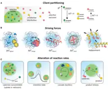 Synthetic condensates offer a way to probe cellular function and organization with high spatial and temporal control, but can also be used to modify or add functionality to the cell. One way this is accomplished is by modifying the condensate networks to include binding sites for other proteins of interest, thus allowing the condensate to serve as a scaffold for protein release or recruitment.[91] These binding sites can be modified to be sensitive to light activation or small molecule addition, thus giving temporal control over the recruitment of a specific protein of interest. By recruiting specific proteins to condensates, reactants can be concentrated to increase reaction rates or sequestered to inhibit reactivity.[92] In addition to protein recruitment, condensates can also be designed which release proteins in response to certain stimuli. In this case, a protein of interest can be fused to a scaffold protein via a photocleavable linker. Upon irradiation, the linker is broken, and the protein is released from the condensate. Using these design principles, proteins can either be released to, or sequestered from, their native environment, allowing condensates to serve as a tool to alter the biochemical activity of specific proteins with a high level of control.[91]