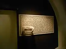 This five-line mosaic inscription (size: 82 cm × 212 cm (32 in × 83 in)) was set in a tabula ansata, placed on the floor of the refectory hall of the monastery.[48] Asomtavruli letters and the frame are made of black tessera on the white background and the mosaic's state of preservation is excellent.[49] Iosia (i.e. Josiah) in the inscription is referenced as "master of mosaics". The name “Josiah” is unknown for Georgian nomenclature of that time. It is the Jewish personal name, represented with the Greek form, a name is not known by other sources. It seems that he was a Christian and is mentioned in the inscription together with his parents. Some scholars consider Josiah to be the person who provided the funds for mosaic in the church.[50] Abba Anthony is identified by scholars with the Jerusalemite Georgian[51] monk and priest Amba Anthony (fl. 596) who had been mentioned in several Georgian sources,[52] who was connected with Simeon Stylites the Younger. Per sources he brought to Simeon the relics of the True Cross, later stayed in Syria, where he became a bishop.[53]