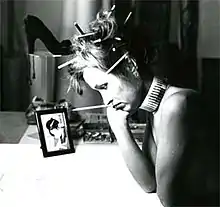 Birgit Jürgenssen (1949–2003) was an Austrian photographer, painter, graphic artist, curator and teacher who specialized in feminine body art with self-portraits and photo series, which have revealed a sequence of events related to the daily social life of a woman in its various forms including an atmosphere of shocking fear and common prejudices.[1] She was acclaimed as one of the "outstanding international representatives of the feminist avant-garde".[2] She lived in Vienna. Apart from holding solo exhibitions of her photographic and other art works, she also taught at the University of Applied Arts Vienna and the Academy of Fine Arts Vienna.[3]