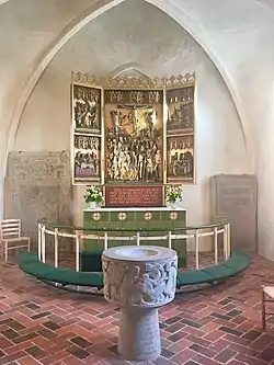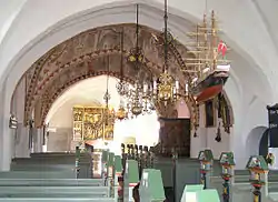The altarpiece dates from the late 15th century and was probably imported from North Germany. It was restored in 1899 and reinstalled in the church as a replacement for a later altarpiece painted by Gustav Theodor Wegener (1817–1877) which can now be seen in the north chapel. The pulpit is from circa 1600 and features King Christian IV's monogram. The five arched niches feature Christ and the four apostles.[5]