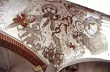 In 1900, frescos depicting a Gethsemane scene were discovered in the chancel by Jacob Kornerup who restored them in 1910.[3] Jesus is depicted before an altar bearing a chalice containing rice, corn and a whip. The three apostles are shown reading as soldiers in armor typical of the 16th century arrive. A pelican with a halo stands in the centre, reflecting a passage from Revelation.[1]