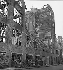 Further heavy raids followed in 1941, on 11 March 135 bombers attacked the city. On 9 and 10 April, Birmingham was subjected to two heavy raids. In the first of these, 235 bombers dropped 280 tonnes of explosives and 40,000 incendiaries, concentrated on the city-centre. The Bull Ring, New Street, High Street, and Dale End all suffered heavy damage, St Martin in the Bull Ring was damaged and the Prince of Wales Theatre and Midland Arcade were destroyed.[8] Other areas including Small Heath, Aston and Nechells, also suffered heavy damage. On the second night, 245 bombers dropped 245 tonnes of explosives and 43,000 incendiaries, causing major damage in Solihull, Hall Green and Erdington.[14] The two April raids caused 1,121 casualties.[8]