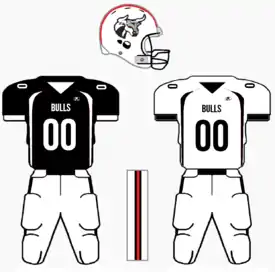 The Birmingham Bulls traditionally play with white helmets, with one thicker black stripe surrounded by two thinner red stripes. Their facemask colour is black. A cut-out of the Bull from the full team logo is positioned on both sides of the helmet. In 2013, the Bulls celebrated their 30th anniversary[24] and reverted to the use of their original "Three Legged Bull" logo for a season.