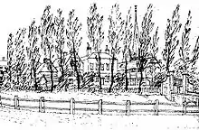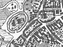 Documentary evidence of the site is slight. The moat may have been associated with the castrum mentioned in the royal charter of 1166 that granted Peter de Birmingham the right to hold a market in Birmingham,[7] though this isn't certain.[8] The site was mentioned again in a survey of Birmingham of c. 1529 that describes the moat and a drawbridge and claims that the buildings were in a ruinous condition.[9] Another sixteenth-century document describes an outer court to the south east of the site.[7] By the time the site was first illustrated in William Westley's 1731 map of Birmingham there appear to have been no medieval buildings remaining apart from a large circular dovecote,[9] and later maps of 1750 and 1778 show four buildings running across the site in a north-south direction.[10] A single illustration of the site survives from 1814, the year before its destruction.[10]