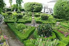 The terraces are supported by decorative granite columns that are arranged along the walls and terraces of the estate.[1] Of these terraces, the lower two were cultivated with vegetables and orchard, divided into blocks flanked by boxwood stools. The upper terrace is occupied by the garden itself and by a terrarium that separates it from the house.[1] It occupies a rectangular terrace surrounded by a wall with tiled floor, decorated pyramids, urns and statuary statues, over the access gates, on the side viewpoints and at the angles, together with the raised beds.[1] Inside the flower beds, are five bowls with water springs, similar to those introduced by Muslims during the 8th century, in the Rocaille style.[1] Among the species in the garden are stands of tulip poplar (Liriodendron tulipifera) that were contemporary to the initial plantation.[1]