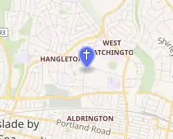 The Benefice and parish of Bishop Hannington Memorial Church includes the Holy Cross Church, a small Anglican church which also worships in the Conservative Evangelical tradition. This is an older building, dating from 1903, and serves the area around Aldrington railway station. There are services every Sunday, including a Communion service each month, and various groups and events for young people both on Sundays and during the week.[6] The boundaries of the parish are Portland Road (between Bolsover Road and Westbourne Street), Rowan Avenue, Hangleton Road, Nevill Avenue and Hove Park.