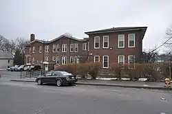 The former Bishop School building is located in a residential area north of downtown Waterbury, on a parcel bounded on three sides by Bishop, Crown, and Beacon Streets. It is a 2-1/2 story masonry structure, built out of red brick with brownstone trim. It is stylistically a mixture of Italianate and Romanesque elements, reflective in part of its evolutionary growth. Its central section is the oldest portion; it has a broad gable and is nine bays wide, with a pair of brick pilasters flanking a bay of paired windows.[2]