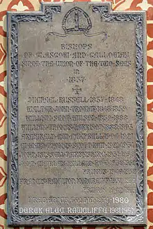 The bishops of the combined See of Glasgow and Galloway[2][3] are listed on two plaques on the south wall of the chancel in St Mary's Cathedral. As the first plaque was filled recording the episcopate of Bishop Rawcliffe, a second plaque was installed following the enthronement of Bishop Taylor.