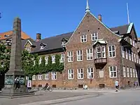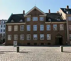 ![]() Bispegården (to the left) seen from Frue Plads with the University in the foreground to the right | |