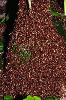 A bivouac is a structure formed by migratory driver ant and army ant colonies, such as the species Eciton burchellii. A nest is constructed out of the living ant workers' own bodies to protect the queen and larvae, and is later deconstructed as the ants move on.[1][2]