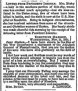 On November 21, both the Boston Evening Traveller and the Boston Evening Transcript published an appeal by Schouler for contributions to assist soldiers' families at Thanksgiving which mentioned a widow who had lost five sons in the war.[8][9] Schouler had some of the donations given to Bixby and then visited her home on Thanksgiving, November 24. The letter from the President arrived at Schouler's office the next morning.[2][10]