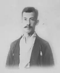 Bizan Kawakami (川上 眉山, Kawakami Bizan, March 5, 1869 – June 15, 1908) was a Japanese novelist of the Meiji era. His real name was Akira Kawakami (川上 亮, Kawakami Akira). Born in Osaka Prefecture, he dropped out of the school of liberal arts in Tokyo University and joined Ken'yusha. After struggling with the rise of naturalist literature yet remaining a popular author until his death, he died by suicide at age 40.