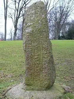 Bjäresjö 2, which is listed in the Rundata catalog as DR 288, has a runic text band that curves into three vertical rows. The granite stone is 1.7 meters in height and the inscription is classified as being carved in runestone style RAK. The stone has been known since 1627.[3] Originally located near the church at Bjäresjö, the stone was first moved to Ruthsbo, which is about five kilometers west of Ystad, and then to the Marvinsholm Park. In 1913 it was moved to the grounds of the Kulturen, a museum in Lund. Based upon comparative stylistic analysis, the inscription is dated as being carved between 970 and 1020 CE.[3]