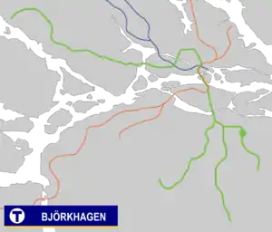 Björkhagen metro station is on the green line of the Stockholm metro, located in Björkhagen, Söderort. The station was inaugurated on 18 November 1958 as a part of the extension from Hammarbyhöjden to Bagarmossen.[2] The distance to Slussen is 4.8 km (3.0 mi).
