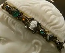 Augustus wears a royal diadem, perhaps originally just shown as the band of cloth whose ends are tied at the back of the head. The strip of gold decorated with jewels is probably medieval, and is recorded as having been repaired at the start of the 18th century, when the cameo was in the collection of Leone Strozzi, Archbishop of Florence, which is as far back as its recorded history goes. This addition may indicate that it was incorporated in a reliquary or some other medieval object, as with another cameo of Augustus used as a centrepiece for the Cross of Lothair.[14] A staff of some kind, perhaps a sceptre or spear shaft, runs diagonally to the left, and the strap over the right shoulder is presumably for a sword at his waist. Similar poses with an aegis are found in Hellenistic art, and the intention was probably to suggest a "fighting ruler, in the tradition of Alexander the Great",[15] who was often shown wearing the aegis.[16] Mark Antony was also depicted wearing it.[17]
