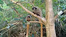 Characteristic of the Callicebinae subfamily, black-fronted titis can be observed with interwoven tails, a behavior thought to reinforce pair bonds and strengthen social relationships.[18][19][20]
