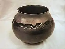 The artists of Kha'po Owingeh (Tewa: [xɑ̀ʔp’òː ʔówîŋgè]), also called Santa Clara Pueblo, and of P'ohwhóge Owingeh (Tewa: [p’òhxʷógè ʔówîŋgè]), also known as San Ildefonso Pueblo, have been making traditional blackware (reduction-fired earthenware) for many years using a coarse-grained clay body decorated with deeply incised or excised designs.[1][2][3] During the firing process in an earthen pit, the fire is smothered with powdered dung which reduces the oxygen without diminishing the heat; this process blackens the clay.[4] Another method of blackening the clay is by "smudging". The pots are surrounded with sheets of metal to reduce the amount of oxygen, and then smothered with damp manure. The smoke impregnates the clay with carbon to produce the blackened finish.[5]