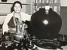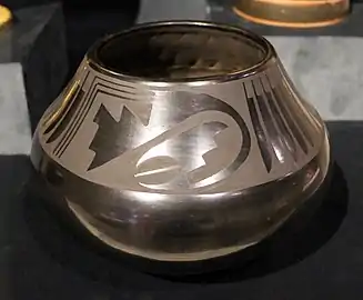Five generations of potters of the Tafoya family of Kha'po Owingeh have been producing incised blackware and later, smooth-surfaced black-on-black ware, notably the matriarch potter Sara Fina Tafoya 1863–1949).[21][22][23] Both Sara Fina (Autumn Flower) and her husband Geronimo (White Flower) produced polished blackware, however it was Sara Fina who expected nothing but "perfection from her children in their ceramic endeavors", while Geronimo was primarily concerned with cultivating food for the family. She was considered the "outstanding Tewa potter of her time" in relation to the beauty, size, and variety of her ceramic work. Some of her work was produced in micaceous clay, but it was making polished blackware, and later carved black-on-black ware where she excelled.[24]