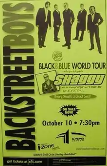 The Black & Blue World Tour was their fifth worldwide concert tour by the Backstreet Boys in support of their fourth album Black & Blue (2000) and the world tour took place in 2001. The first leg of the tour kicked off January 22, 2001 in the United States.[1] The second leg began June 8 in the group's hometown of Orlando, Florida, and was temporarily put on hold July 9, in order for group member A. J. McLean to seek treatment for clinical depression which led to anxiety attacks and the excessive consumption of alcohol. The tour resumed August 24 in Milwaukee, Wisconsin, and wrapped up October 19 in Paradise, Nevada. The Boys then continued their tour around the world before it came to a close by the end of 2001. It grossed over US $315 million worldwide, becoming the highest-grossing concert tour by an artist in general of the year.[2] The tour was sponsored by Burger King,[3] Kellogg's and Polaroid.[4]