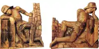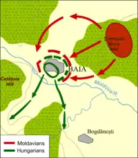 ![]() Adolf Liebscher: George of Podjebrady observes the encircling army of Matthias. ![]() Věnceslav Černý: Henry Podebrady's victory over the Hungarians at Uherský Brod in 1469 ![]() Mikoláš Aleš: Meeting of George of Podebrady with Matthias Corvinus ![]() Statue of King Matthias and his generals in Cluj-Napoca. From left to right: Pál Kinizsi, Balázs Magyar, King Matthias, István Szapolyai and Stephen Báthory. ![]() Portrait of Balázs Magyar ![]() The Battle of Breadfield ![]() Battleplan at Baia depicting a typical wagon-fort formation, characteristic of Hungarian defense (and siege) strategy. Matthias was wounded in the back by arrows. ![]() Battleplan at Vaslui ![]() Castle of Salgó. Occupied by – then enemy – Jan Jiskra in 1450, it was retaken by Matthias in 1460. According to tradition, Matthias was cut on his face, and the scar angered him to the point where he launched an assault on the nearby Zagyvafő and destroyed the two castles to the ground.[44] ![]() Austrian lands in 1477