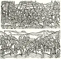 In case of emergency, a last chance existed for the actual king in power to mobilize the population suddenly. Every noble, no matter his social class, had to participate in person with his weaponry and all of his personal guards made available. These were the estate armies.[7] Whenever they were called upon, they were not allowed to fight for longer than 15 days, and their field of operations was restricted to within the borders of Hungary. The so-called insurrectio (noble "insurrection") was nothing more than an obsolete form of drafting, but it was valid until the Battle of Raab in 1809, mainly because it relieved the participating nobles of paying their taxes; but generally, these enlisted armada played a minor role in the Black Army, since Matthias decreased their participation gradually and called them up in large numbers early in his reign.[16]