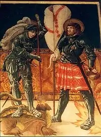 | Heraldry | This characteristic flag with a forked tail was reconstructed after a miniature in Philostratus Chronicle, one of the Corvinas, representing the 1485 entry of János Corvinus, son of King Matthias, into Vienna. The black colour of the flag used to be white (argent), but the argent paint oxidized. The reconstruction preserves the original colour. |
