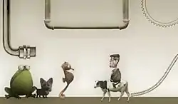 ![]() In a hallucination by drugs, Walter imagines himself in a Terry Gilliam/Monty Python-inspired cartoon, here riding Gene the cow and seeing a frog (one of the Fringe glyphs), dog, and a seahorse (another of the Fringe glyphs). | |