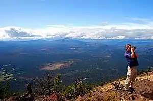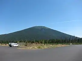 The Black Butte hiking trail runs for about 2 miles (3.2 km) from a trailhead up the butte.[22] Trees thin in the second mile of the hike.[22] The trailhead is particularly busy during the summer season with vehicles and hikers, though the hiking trail itself is for hikers only.[23] The hike is popular and not demanding, climbing about 1,600 feet (490 m) to the peak, where Three Sisters, Mount Washington, and Mount Jefferson can be seen.[31]