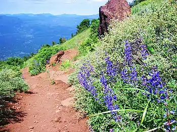 Black Butte lies east of the major crest of the Cascades, which is more arid compared to the Western Cascades.[19] Two forest populations at Black Butte were analyzed in a 1975 study conducted by D. B. Zobel of Oregon State University. These forest areas included ponderosa pine and tree species intermediate to grand and white firs.[19] The study found that trees at Black Butte did not experience significant moisture stress[20] and that photosynthesis rates during dry summer seasons were more reduced at tree sites in the Western Cascades compared to at Black Butte.[21] Black Butte was found to have a shorter growing season and less favorable winter temperatures for photosynthesis at its forest sites than study areas in the Western Cascade Province.[21] Along the trail that runs up Black Butte, the forest is diverse, with yellow-bellied ponderosa pines, mixed conifers, and subalpine vegetation.[22]