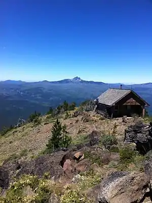 The butte had a fire lookout ground house,[42][43] which was built in 1979 out of wood,[44] though the butte has been used for fire detection since 1910.[31] Fire lookout staff used the station to cook and sleep before it was condemned in 2014 and burned down in 2016 by the United States Forest Service, who released a statement that it "was ineligible for preservation as a historical structure both in time and because of improvements made."[44] Lookouts still work at Black Butte during the fire season but use a yurt (a type of portable tent) instead.[44] There has been a white cupola structure on the top of the butte since 1923 and a more modern fire lookout tower, 62-foot (19 m) tall, which was built in 1995; neither are accessible to visitors.[31]
