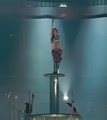 It was performed on the Rhythm Nation 1814 World Tour, in a "pyrotechnic interpretation" which ends using illusionary magic of Jackson transforming into a panther in a cage.[72][73] During the act, "menacing, feline dancers forced Jackson into a cage and covered it with a silver cloth. When they pulled it off, a real, live panther was prowling inside."[74] The performance was also considered as "a rocker booming with guitar solos and fireworks", commended for "utilizing illusions" to entertain the crowd.[49] Dave Tianen of The Sentinel added, "Shifting emotions as quickly as she shifted her head, shoulders, and hips, Jackson and crew launched into a thrashing version of "Black Cat", completed by whining guitar rifts comparable to much heavy metal."[47] On the tour's opening night, Jackson stated, "The black cat, he peed - on stage!", causing her and several dancers to slip and fall while performing.[58] The panther, named Rhythm, was subsequently removed from the tour after the first leg due to safety concerns, as well as her own love of animals.[75]