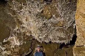 Black Chasm was likely known about by the local Miwok tribes, though gold miners were the first credited with exploring the cave in 1854. The miners described the cave as having "...vaulted chamber[s] large enough to contain the largest trees..." and "... crystals [that] stood out from the walls in every conceivable direction, turning and bending into many shapes...".[2] These turning and bending formations are known as helictites and are an unusual formation in cave systems throughout the world. Somewhere near the 1860s, the cave entrance was enlarged from its original 18" wide crack in order to accommodate stairs for tours. The tours lasted only a short time before the cave was abandoned.[3]