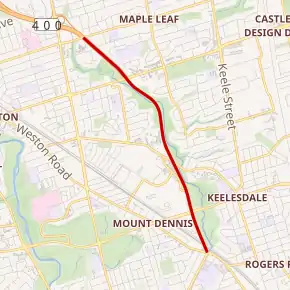 Fresh from battling the Spadina Expressway, anti-Spadina groups started battling the extension and soon, Parkdale residents joined in the debate, fearing an extension would pass directly through their neighbourhood.[15] Additionally, the City of Toronto objected to the construction of the road south to St. Clair Avenue. A compromise was reached at Weston Road; the 400 Extension would end there, but Weston Road would be widened to support the flow of traffic from Black Creek Drive.