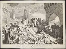 In March 1348 the plague reached Florence, where it lasted until July.[1] Neither formally educated medical doctors nor the traditional male and female folk healers and medical practitioners could do anything about it.[1] The infected died within three days, people were infected by the smallest contact even with the clothes or other objects handled by the ill.[1] Boccaccio witnessed dead bodies being thrown out upon the streets, after which the animals who started to touch it fell down dead.[1] Priests and other authorities died so swiftly that the administration and law and order collapsed.[1] People refused to bury their dead, who were instead buried by a special group of grave diggers recruited from the poorest beggars, the becchini, who charged enormous sums to throw the bodies in mass graves.[1] Those who could not pay left the bodies on the street, which were soon full of rotting corpses.[1] In the countryside outside Florence, the peasantry fell down dead in their fields which were abandoned by the living, who let loose their animals and ate their supplies because they lost the hope of surviving.[1] Matteo Villani described how people in Florence, expecting their death, lived to enjoy life without consequences: the poor ignored the class system and started to eat luxury food and dress in fashion of dead aristocrats, and how people started to marry anyone they wished without considering class, status or suitability.[1]