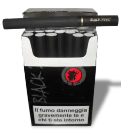 ![]() An old Italian pack of Black Devil cigarettes, with an Italian text warning at the bottom of the pack. | |