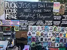 The Black Lives Matter Memorial Fence (BLM Memorial Fence) was a two-block eight-month long protest art installation of Black Lives Matter memorials attached by visitors and community activists to the chain link fence outside the White House on H Street, between Vermont Avenue and Connecticut Avenue NW in Downtown Washington, D.C. in 2020 and 2021. The 1.7-mile cordon of fencing around the White House was erected to move the growing crowds of protesters gathered at and around Lafayette Park after the murder of George Floyd on May 25, 2020.[1] The Memorial Fence developed from June 2020 until it was dismantled and archived in January 2021. Members of the public worked together to maintain, protect, and then archive the thousands of signs and artworks that were offered by the public.