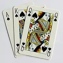 The games uses a standard French pack, normally of the English pattern, with 13 cards in each of the four suits: Hearts, Spades, Diamonds and Clubs. The cards rank in their natural order, Aces high: A K Q J 10 9 8 7 6 5 4 3 2. There is no trump suit.[1]