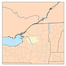 The Black River is a 125-mile-long (201 km)[4] blackwater river that empties into the eastern end of Lake Ontario on the shore of Jefferson County, New York in the United States. The origin of the name is not clear, but it may stem from the natural tannic acid that darkens the water in places. The river flows in a generally northwest direction, with its valley dividing the Adirondack Mountains on the east from the Tug Hill region to the west.